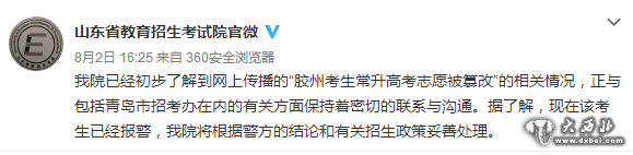 对此,8月2日,山东省教育招生考试院官方微博发布信息,称省招考院已经初步了解到网上传播的“胶州考生常升高考志愿被篡改”的相关情况,正与包括青岛市招考办在内的有关方面保持着密切的联系与沟通。