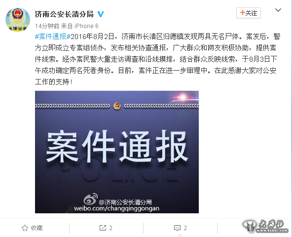 济南公安长清区分局官方微博今日发布消息称,2016年8月2日,济南市长清区归德镇发现两具无名尸体。今天下午警方已成功确定两名死者身份,案件正在进一步审理中。