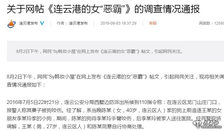 8月2日下午,有网民在网上发布《连云港的女“恶霸”》帖文,引起网民关注。8月3日,连云港市人民政府官方微博通报事件调查情况。