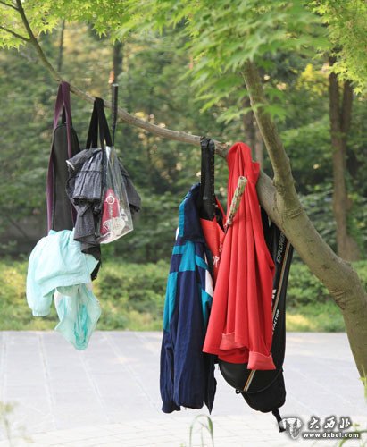 资料图片:游客把衣服、袋子等物品悬挂在南京中山风景区一棵小树上。