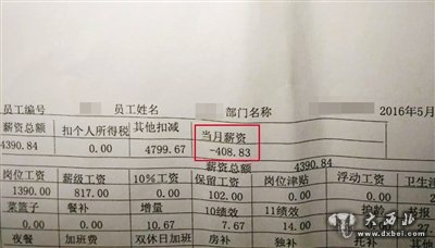 杨女士提供给记者她今年5月份的薪酬单,显示其该月的薪资总额为人民币4390.84元,包括岗位工资、薪级工资、保留工资、临补等项,应扣项目合计为人民币4799.67元,其中包括住房公积金、养老金、失业险、医疗险、停车费、会费等。两项加减,最后其当月薪资在0元以下,为人民币-408.83元。