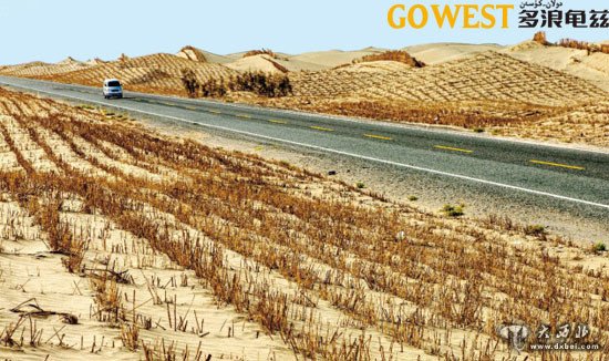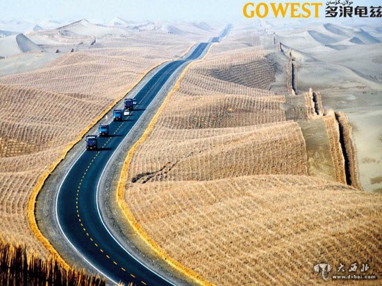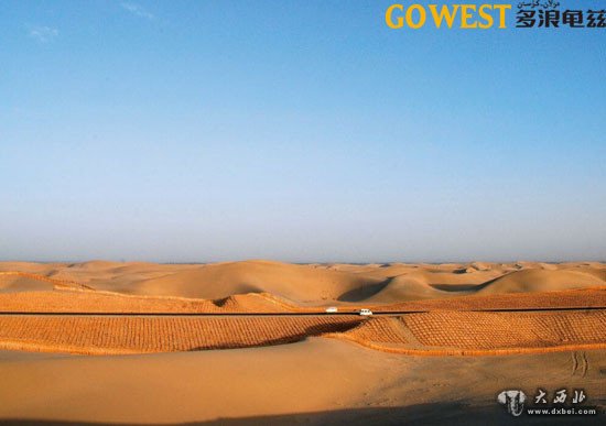 于是在公路建成后不久,就在公路两旁铺设了5000多万平方米的草方格固沙带和900多公里的阻沙栅栏。每个大约1平方米大小的草方格从空中俯瞰,就像是躺卧的巨龙的鳞片,在阳光的照耀下闪闪发光,然而细看之下,却又像一根无力挣脱的巨大铁链,把疯狂肆虐的猛兽紧紧锁住。冬天的时候,排列整齐的草方格布满白雪,与金黄的沙漠形成强烈的色彩对比,更是成为沙漠中一道难得的风景。