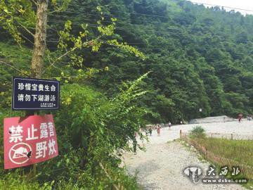 湖水水位看起来并不高,只是湖面中央水草丛生,水草在水注入时不断摇曳,无法从湖面判断水的深浅。当地村民告诉记者,溪水是西岭雪上的冰水,温度比一般的山泉水要低得多,所以,即使是夏天,脚放下去几分钟就会感觉到非常冰冷。