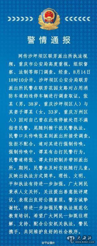 今日中午,重庆市公安局发布了“网传沙坪坝区联芳派出所执法视频”的警情通报。通报称,8月14日,民警在对占用消防车道的违停车辆进行调查取证时,当事人因对自己曾在此违停被处罚不满指责民警,尾随纠缠干扰民警执法。