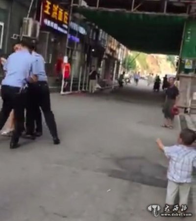 视频显示,起初一名穿蓝白条纹上衣的男子与一穿警服、手持摄像仪的男子争执,一名女子抱着两三岁的孩子站在旁边。