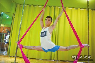 除了钢管舞,王建还擅长吊环舞和绸缎舞。