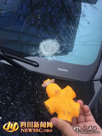 曾先生告诉四川新闻网记者,是一个胶质的多孔插座从天而降将轿车挡风玻璃砸坏的。