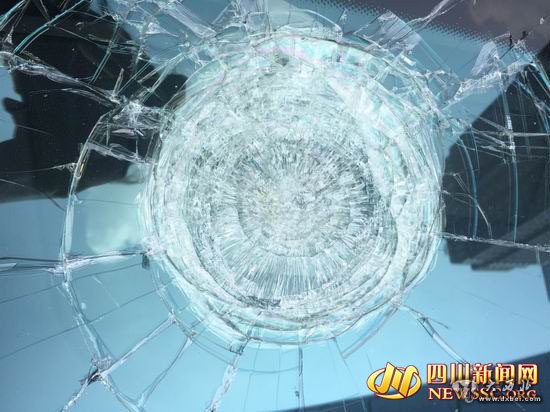 副驾前方的挡风玻璃被砸出一个大坑,大坑周围的玻璃也出现了裂缝。