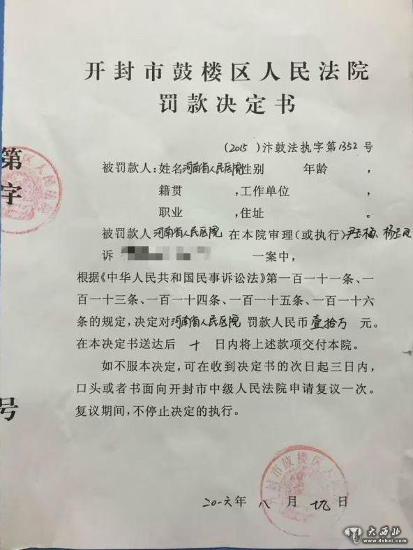 8 月 19 日,河南省人民医院收到开封市鼓楼区人民法院的一份罚款判决书,罚款 10 万元,并附上被罚款的原因。