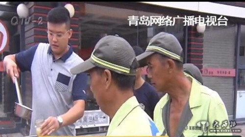 五种口味的青岛大包,小米稀饭管够,别看样式简单,环卫工人们却吃得津津有味。记者了解到,这个特殊的早餐点,已经开张半个多月了。到底是谁张罗的?一位环卫工人告诉记者,眼前这位人高马大的85后小伙子,就是免费早餐活动的发起者。