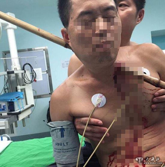 宜宾市二医院质管部副主任周浩全程参与了伤者在宜宾的救治工作,据其介绍:伤者送来时,有一根竹竿直接插入了身体。经医生检查,该根竹竿长约两米,从伤者的左颈部插入,右颈部穿出。