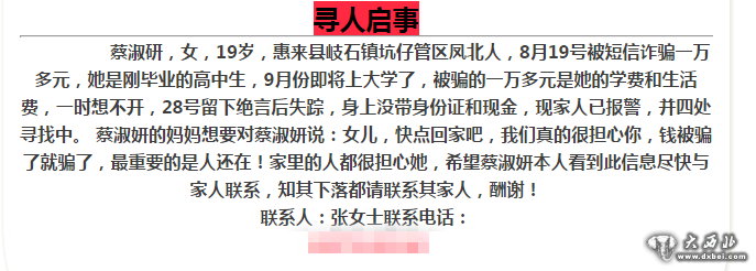 几天来,广东省惠来县的论坛、微信公号上都在转发一条寻人启事。该县歧石镇坑仔管区的19岁女孩蔡淑妍失踪了。寻人启事上蔡淑妍的母亲对她呼唤:“女儿,快点回家吧,我们真的很担心你,钱被骗了就骗了,最重要的是人还在!”