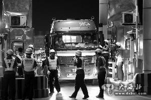 执法人员在宁杭高速苏浙省界主线收费站检查
