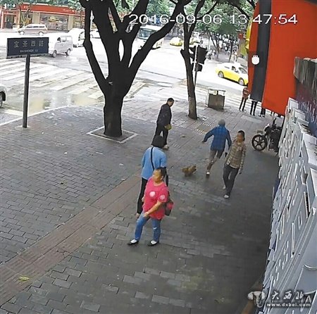 民 警调取事发现场的监控视频看到,6日13:47,那名老太经过宝圣西路红绿灯附近人行道时,突然一只棕色泰迪宠物狗从她右边一辆摩托车旁快速窜了出来。当 它来到老太跟前时,绊住了老人的右脚,老人随即受惊摔倒在地。过了一会儿,她才吃力地挣扎着坐起来,并用左手不停地摸着右手喊痛。监控显示,老太倒地后, 那只闯祸的泰迪立即跑开,但并没有跑远。随后,它在老太周围来回转了好几圈,始终没有“逃离”现场,也没发现有人前来领走它。很快,就有过往市民上前询问 老太的情况,但都不敢贸然上前搀扶。