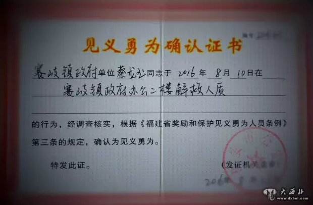 7日,福安市赛岐镇镇长蔡龙玉因夺刀勇救女干部,收到福安市公安局颁发的“见义勇为”确认证书。