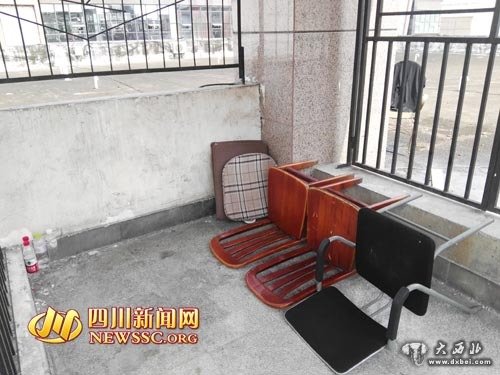 按照市民提供的地点,四川新闻网记者来到该男子露宿地点。不过,却并没有看到人,楼梯上满是烟头。这里摆放着三张凳子,全部有序的倒在地上,凳 子的四个脚里放着伞和一个塑料口袋。凳子旁边是一扇铁珊门,能够打开。打开后就是楼顶,楼顶上的一张凳子上放着一件黑色的T恤。