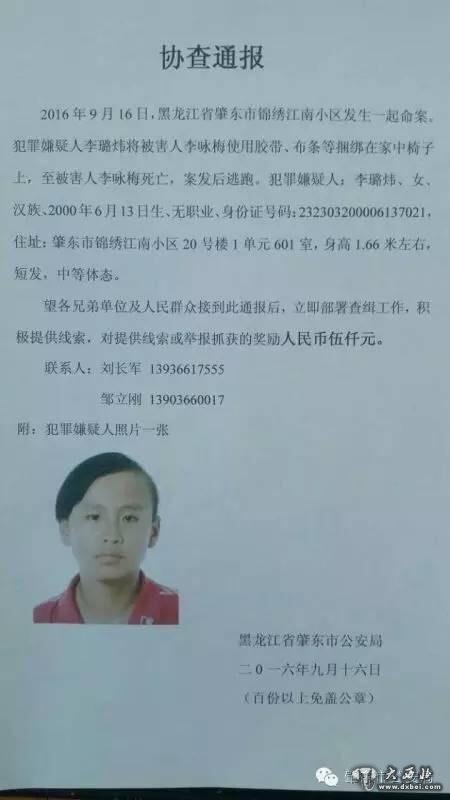 黑龙江绥化肇东市一女子9月16日上午在家中被捆绑杀害。肇东市公安局官方微信发布的协查通报称,犯罪嫌疑人为一名16岁少女。