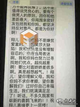 短信中还点名表示越看吴莎越觉得差:“我和你妈不是嫌贫爱富的人,因吴莎太缺陷!我和你妈是没有理智容忍的,你是当局者迷啊。我和你妈也努力过寻找她们优点。越找越差啊!要比对面娇娇差很多啊。真是越想越气!”