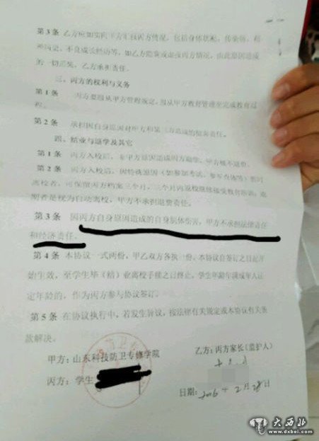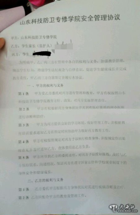 陈欣然被送进山东科技防卫专修学院时,他的父亲和学校签订的协议。