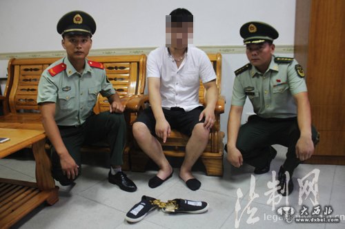 图为边防官兵从男子鞋中查出三块无合法来源的金砖