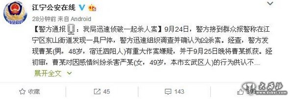 警方通报,9月24日,警方接到群众报警称在江宁区东山街道发现一具尸体,警方迅速组织调查并确认为凶杀案。