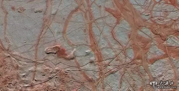 来自NASA伽利略号探测器(Galileo)的增强颜色的图像展示了木星的卫星欧罗巴冰层表面上错综复杂的线性裂痕。