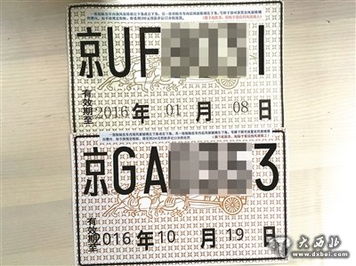 9月19日,北青报记者和对方商定,以1100元的价格购买两个月的临时号牌。20日下午,对方通过中通快递送来了两副棕底黑字的临时号牌。其中一副签发时间为9月19日,有效期至10月19日;另一副签发时间为10月19日,有效期至11月19日。