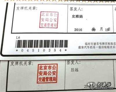 北青报记者发现,自己收到的临时号牌与车管所出具的临时号照非常相似,机动车所有人、住址、车辆类型、厂牌型号等信息也与自己提供的行驶本信息完全一致。