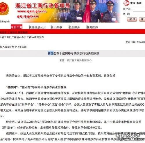 9月27日消息,浙江省工商局日前公布了十起网络专项执法行动典型案例,其中包括“傻推网”、“整点抢”等网络平台炒作商业信誉案。