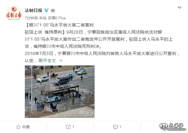 9月28日,宁夏回族自治区高级人民法院依法对银川“1·05”马永平放火案作出二审裁定并公开开庭宣判,驳回上诉人马永平的上诉,维持银川市中级人民法院死刑判决。
