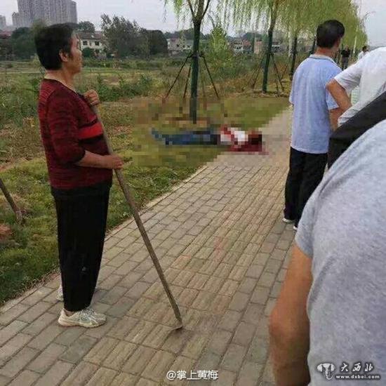 案发现场,一名男子躺在路边草丛里,上衣被鲜血染红。
