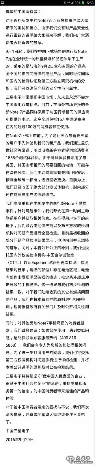 【北京时间科技记者 马兴】9月29日下午,沉寂了十天的三星公司,终于发布声明向公众表态。三星在最新声明中称,国行三星Note7自9月1日起,在中国的国行Note7采用的是不同于海外的电池供应商,经三星与第三方机构严格检测,不存在安全问题。而目前国内发生的多起国行Note7电池燃烧爆炸问题,经三星与电池供应商联合第三方检测机构检测,不存在电池内部燃烧问题,问题手机为外部加热所致。最后三星希望目前依然不断出现的国行三星Note7电池燃烧问题的用户请与三星联系,并送至国内外权威第三方检测机构中国泰尔实验室及Exponent实验室检测。