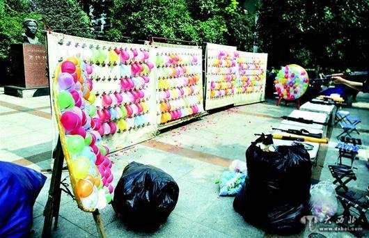 中午12时30分许,楚天都市报记者现场看到,小贩在游园广场摆了七八个射气球摊。其中两个挡在萧栋栋的塑像前,每当有游客经过,小贩就大声吆喝揽客。客人拿起气枪,“啪、啪、啪”的枪声和气球破裂声不时响起。