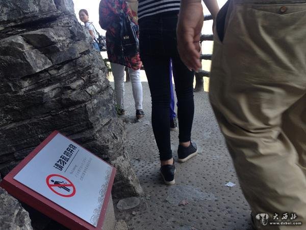 栈道上虽有“请勿乱扔弃物”提示标语,但仍有游客将垃圾抛到悬崖下。