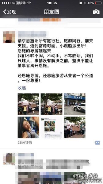 事发后,有导游很快将此事件上传当地导游自建的微信群,引起群内300余名导游声援,一些导游自发赶到派出所要求严肃处理。