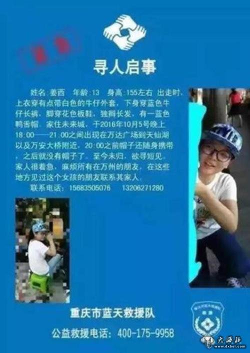 将近两天时间过去,但姜西却依然没有半点音讯,父母和亲戚朋友仍然在继续寻找,警方和长航公安也在积极的搜寻中。如果有市民知道姜西的下落或见到姜西,可与其家人取得联系。