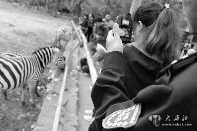 10月6日15时许,《法制晚报》记者在北京动物园非洲动物区斑马园护栏边上看到,两名游客从一个红色塑料袋中掏出白菜叶子,其中一名游客先拍打护栏引起斑马注意,待一只小斑马靠近后,便伸出手中的菜叶逗弄斑马、拍照。