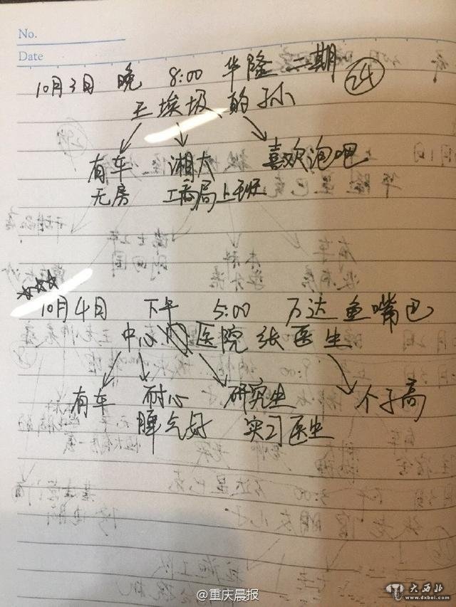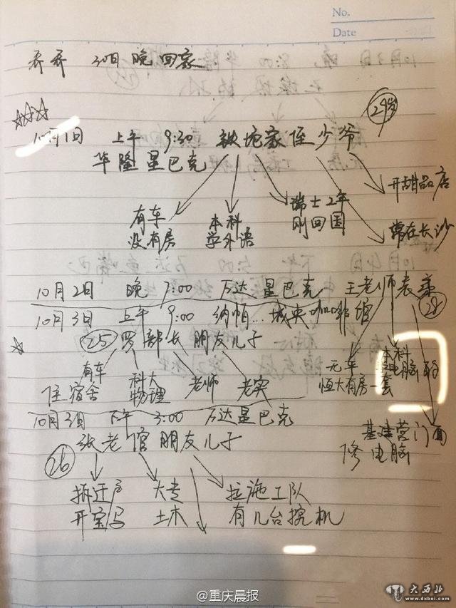 重庆晨报讯 一名女网友表示自己国庆期间被老妈安排满了相亲局。昨天晚上她给老妈收拾书房时,发现这个相亲预约表。虽然老妈把学网络安全的叫“学电脑的”,“挖机”也写错了但是看到之后又无奈又感恩,老妈永远是为我们操心的那个人。