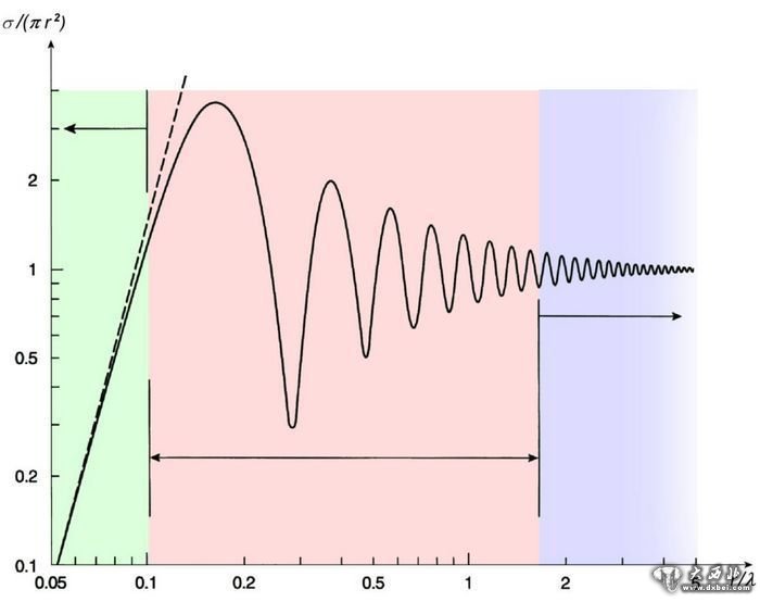 “隐身技术”其实是“低可探测技术”的俗称。这是一种以减少自身电磁波信号特征为目的而采取的一系列技术措施的集合。从被探测物的大小、反射特性与电磁波的波长的关系图上可以看出随着雷达波长的变化,目标的RCS可分为瑞利区、震荡区和反射区三个区域。火控雷达为获取目标的精确方位通常都采用波长厘米级的微波波段,因此隐身技术主要依赖外形设计精确控制光学反射区的反射波束方向。在面对和自身体型差不多的瑞利区和震荡区内隐身设计手段基本失效。