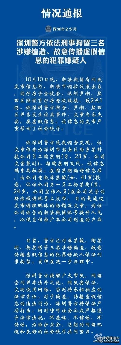 10月10日晚,新浪微博有网民发布信息称,新楼市调控政策出台,因炒房资金被套,深圳罗湖、盐田区陆续有朝方老板跳楼,致2死1伤谣言。经警方核查,罗湖、盐田区并未发生该类事件,文章内容失实,属虚假信息。