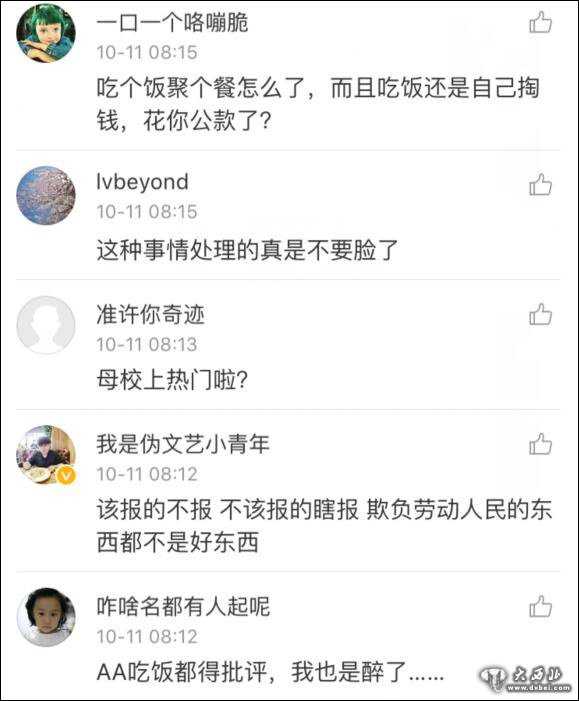 大多数网友对这则通报表示质疑,通报中提到这几位教师是在学校放假后聚餐,共花费1390元,还是AA制付费,一不是工作日,二不是公费付款,教师节前聚餐庆祝无可厚非,因此,网友对屯留纪委的这份通报表示不理解,纷纷为被通报的教师们抱不平。【重庆2名单身男女公司聚餐 相处4小时闪婚】