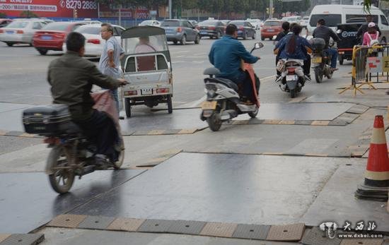 10月11日,济南经十路和纬十二路交叉口东侧,三十余米的路面上铺着几块大型钢板。每块钢板的四周围上了大大小小的减速带,远远看上去,像在衣服上打的“补丁”,市民骑电动车和三轮车经过时,都会发出“咯噔”“咯噔”的响声,车轮上蹦下跳让人很难受。