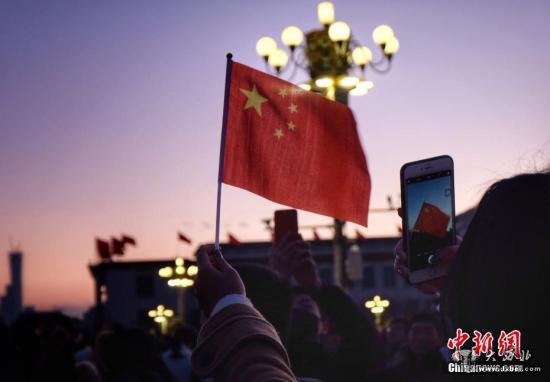 2018年1月1日,随着晨曦的第一缕阳光照耀在天安门广场,五星红旗冉冉升起。数万民众现场观看了2018年的第一场升国旗仪式。中新网记者李霈韵摄
