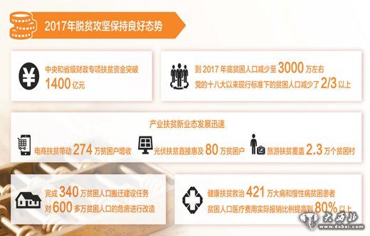 我国脱贫攻坚取得决定性进展,2017年底贫困人口减少至3000万左右。国务院扶贫办主任刘永富说:“脱贫攻坚大局已定。从目前看,总体上完成任务应该问题不大。现在,我们要由打赢向打好转变。”