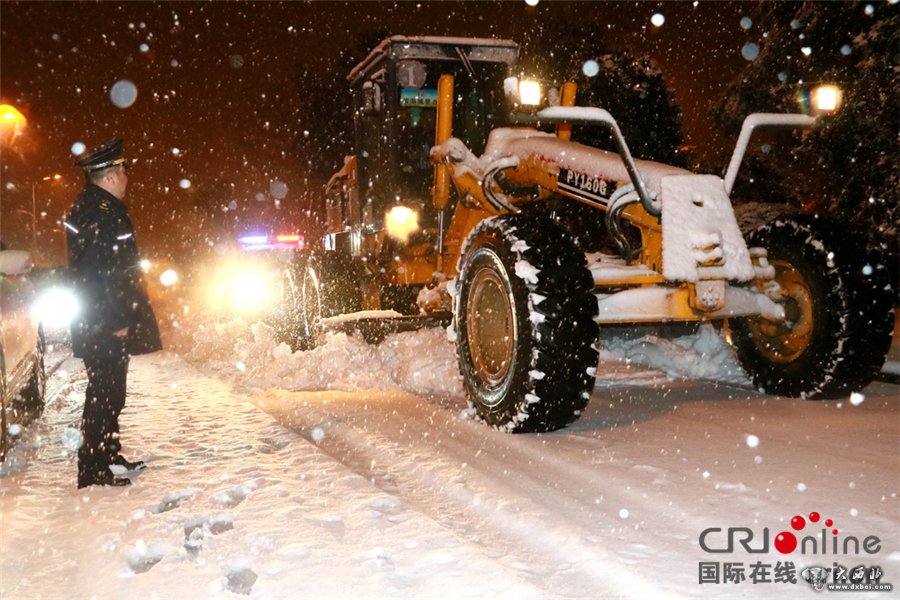 城管干部和除雪车在机动车道上彻夜除雪,保障机动车道的畅通