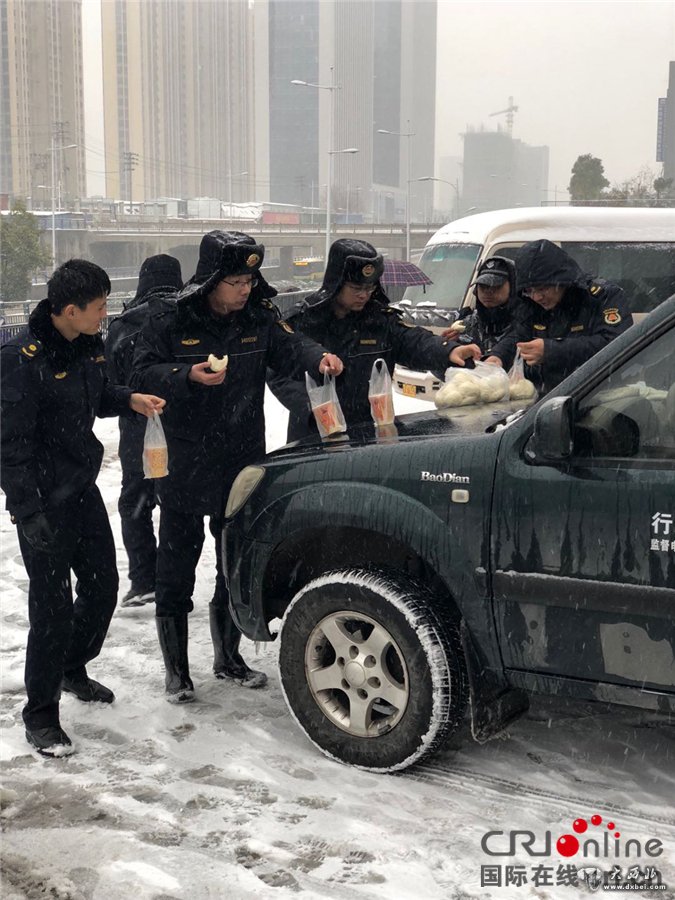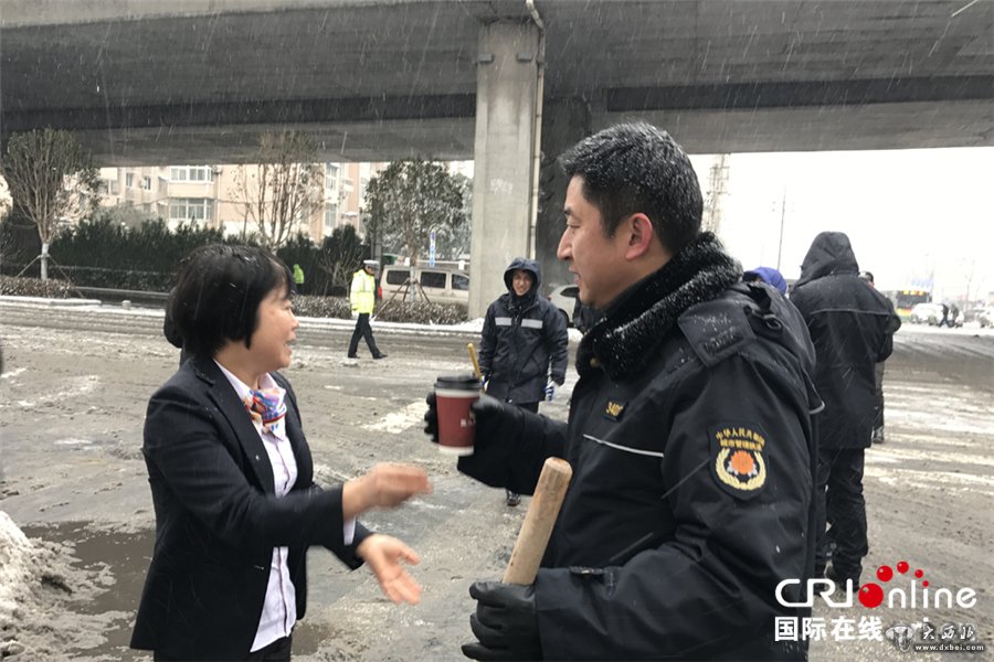 附近的商家为除雪中的城管干部送来热茶