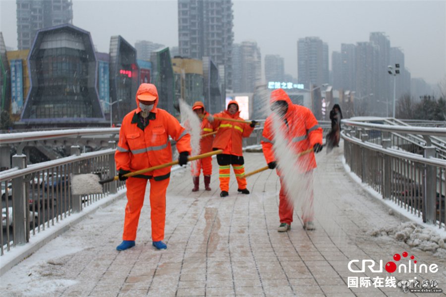 环卫工人们在人行天桥上撒融雪剂