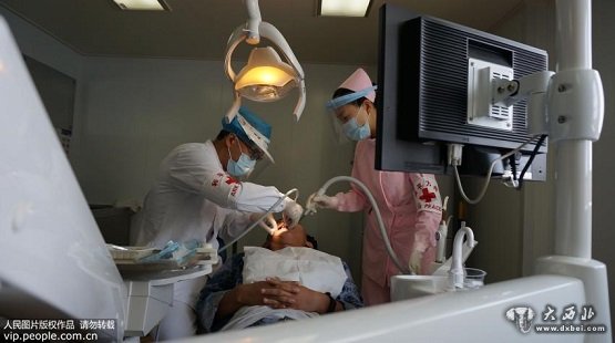 8月16日,和平方舟医护人员在主平台为扬州舰舰员进行智齿拔除。