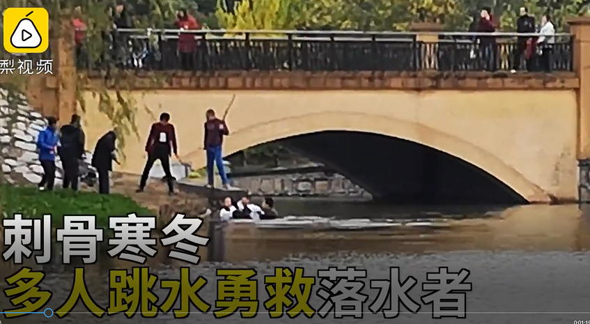 图说:一批业余足球队员在寒冬腊月跳入刺骨河水,成功救助溺水女子上岸。