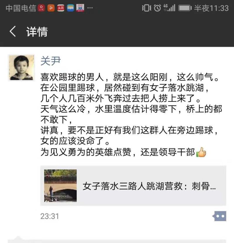 先下场休息的韩平、李雄伟等三名队员,听到声嘶力竭的呼救声后,像离弦之箭冲了过去。“我在后面跑,远远看到他们三个一边奔跑一边脱去厚外套,然后直接跳入冰冷的河水。”孙吉告诉解放日报·上观新闻记者,“当时家属在求救,旁边桥上也有在观望,但真没人跳下水去救人。还好有这么一批踢球的业余足球队员在附近,否则真的不好说。”